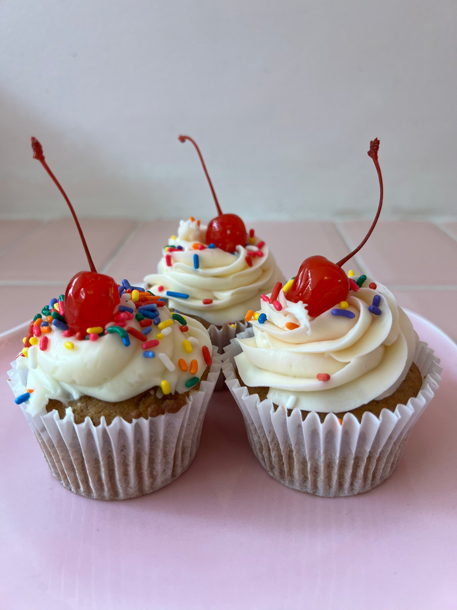 Our newest cupcake flavour! A banana sponge topped with cream cheese icing and decorated with multi coloured sprinkles and topped with a cocktail cherry.