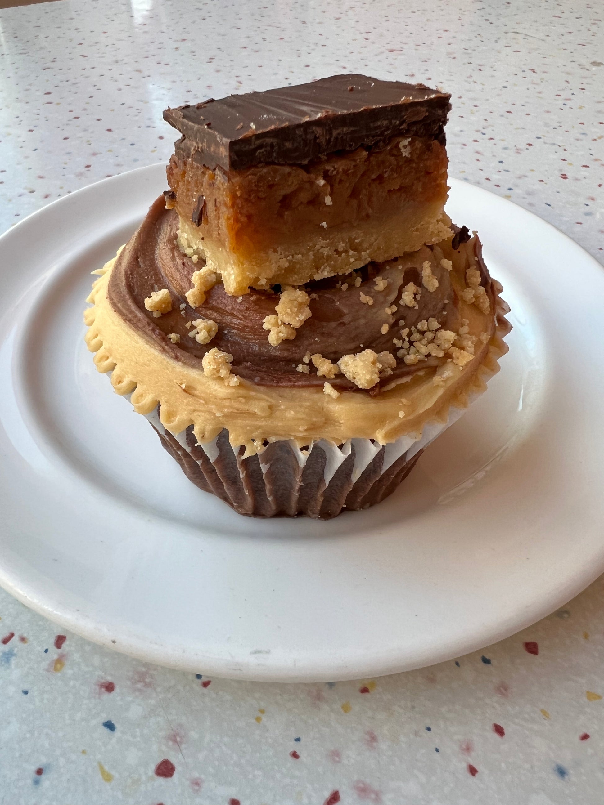 New for 2024! Our classic chocolate cupcake filled with our homemade caramel sauce then topped with a chocolate caramel swirl and finished with a sprinkling of biscuit crumble and a piece of our delicious homemade caramel slice!