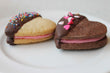 Two chocolate or vanilla heart shaped biscuits sandwiched together with pink butter cream, dipped in 70% dark chocolate and dusted with sprinkles. A delicious Valentine's treat.