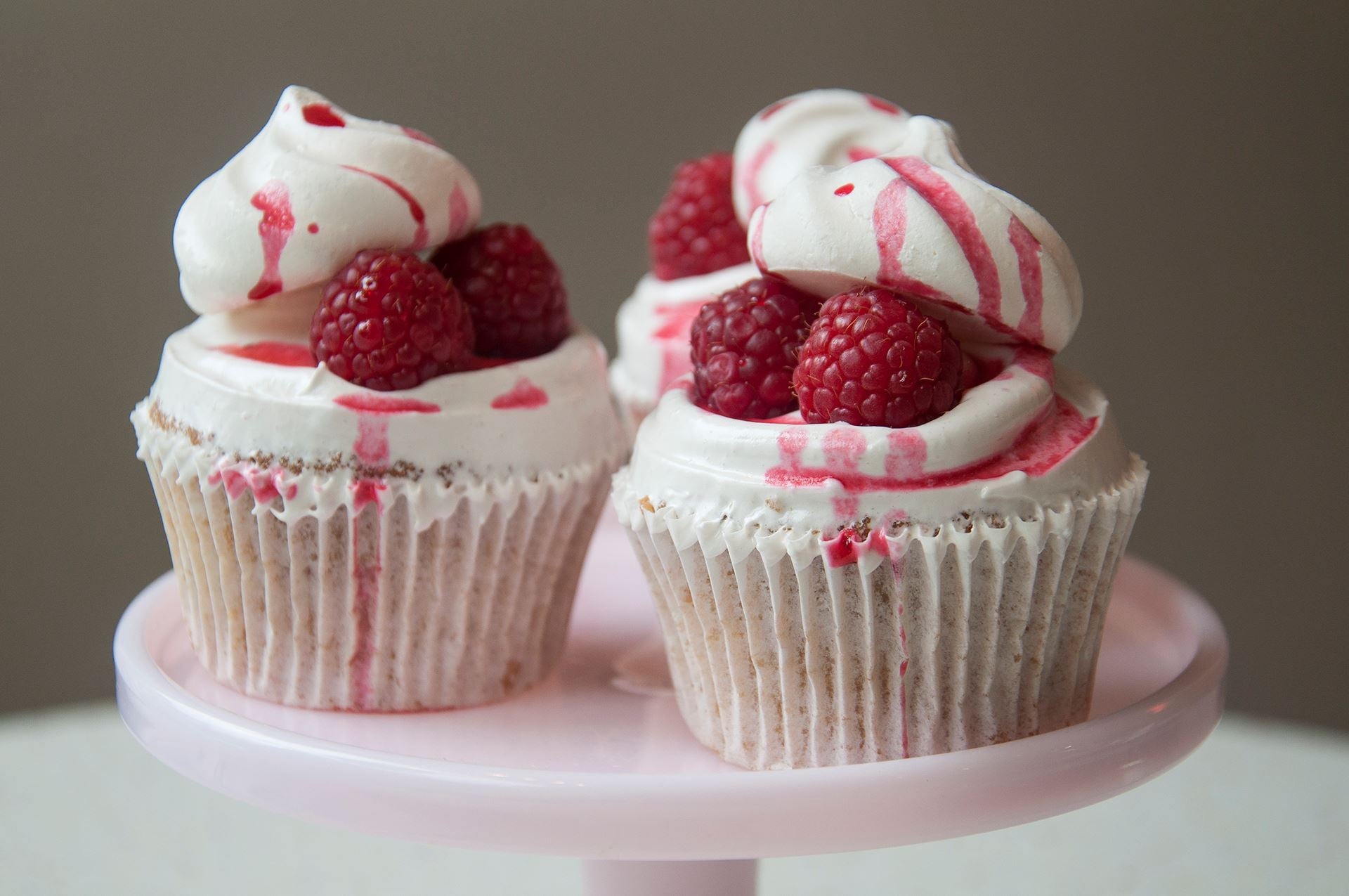 A traditional british dessert, available in a cupcake form! A light raspberry sponge, filled with raspberry jam, and topped with a marshmallow icing. The cupcake is finished with fresh raspberries, a whole mini meringue and drizzled with raspberry coulis.