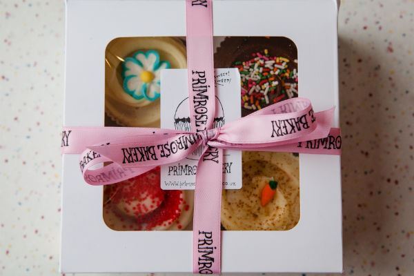 A little selection of 4 delicious regular size cupcakes chosen from the flavours we have everyday in the bakery. A wonderful gift, each box is ribboned with our pretty pink Primrose Bakery ribbon and can have a personalised note attached. Available when ordered online now.