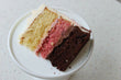This triple layer cake brings together a classic flavour combination of strawberry, chocolate and vanilla. This cake has three layers of different flavoured sponge, with chocolate, pink and cream vanilla buttercream icings covering the cake on top and down the sides.