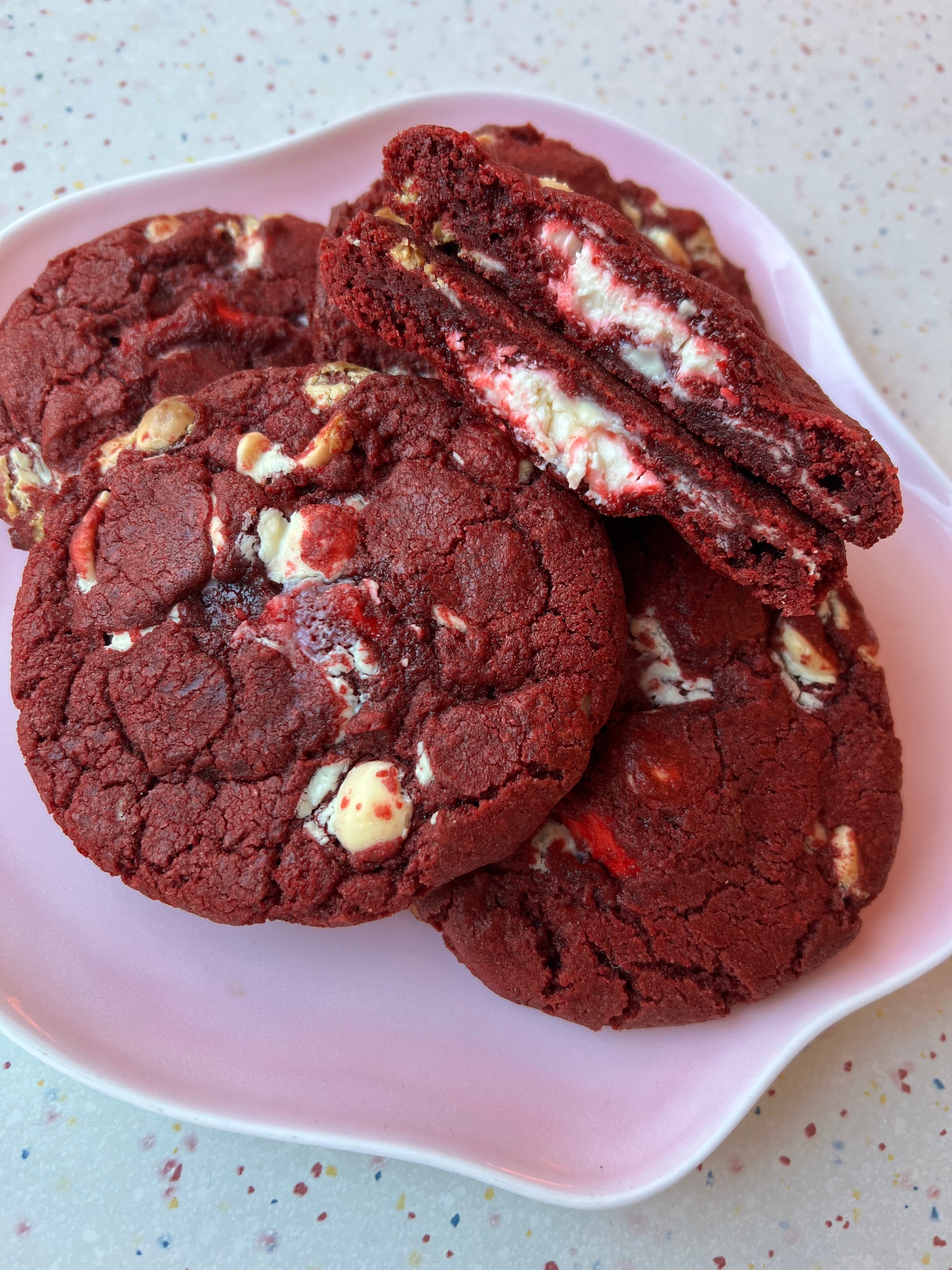 New for 2024! A cookie version of our best selling red velvet cupcake - with white chocolate chips and a secret cream cheese centre!