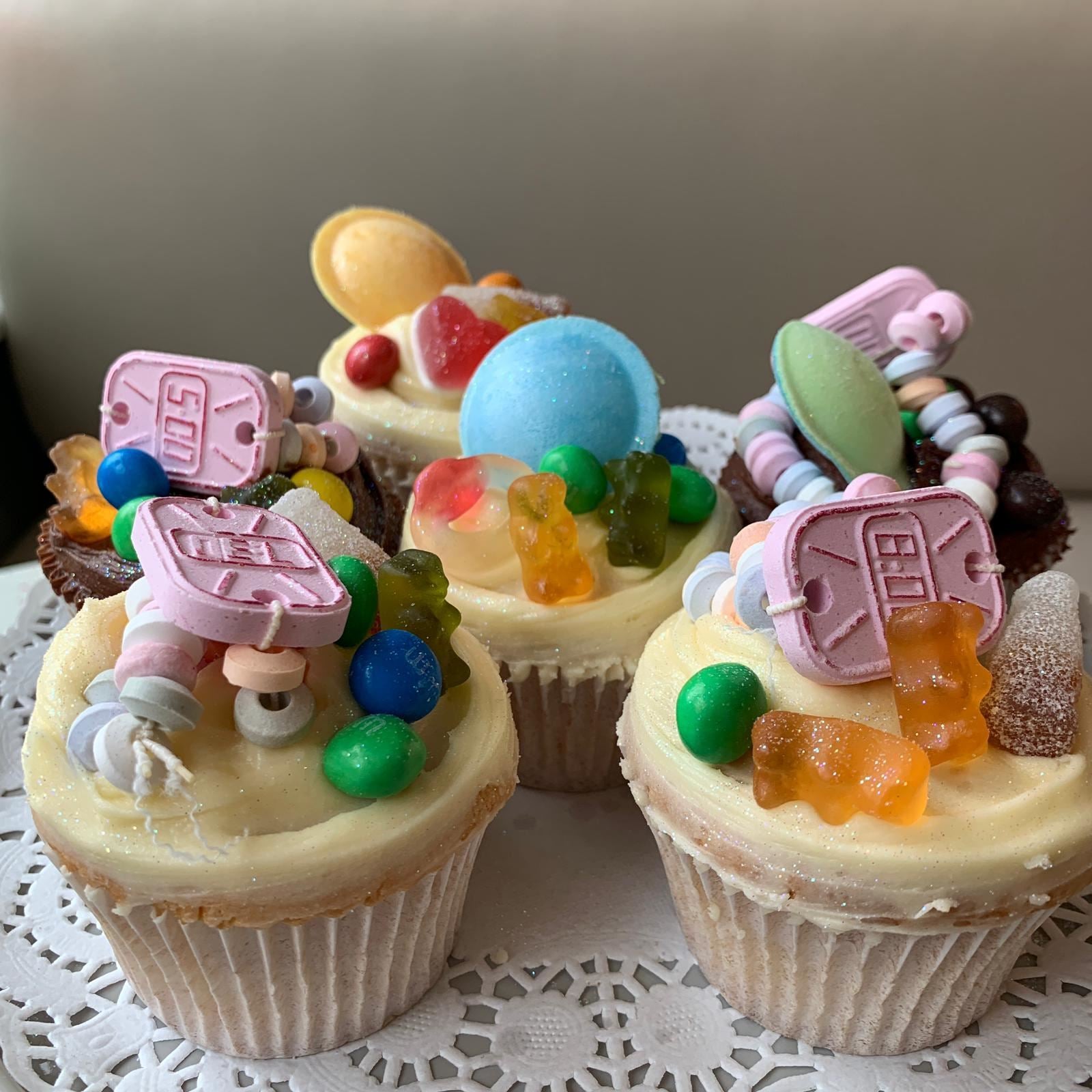 This is our classic vanilla or chocolate cupcake recipe with vanilla buttercream topped with a variety of retro sweets!