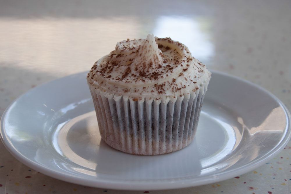A marbled chocolate and vanilla sponge with a coffee soaked sponge finger in the middle topped with a mascarpone buttercream and dusted with cocoa.