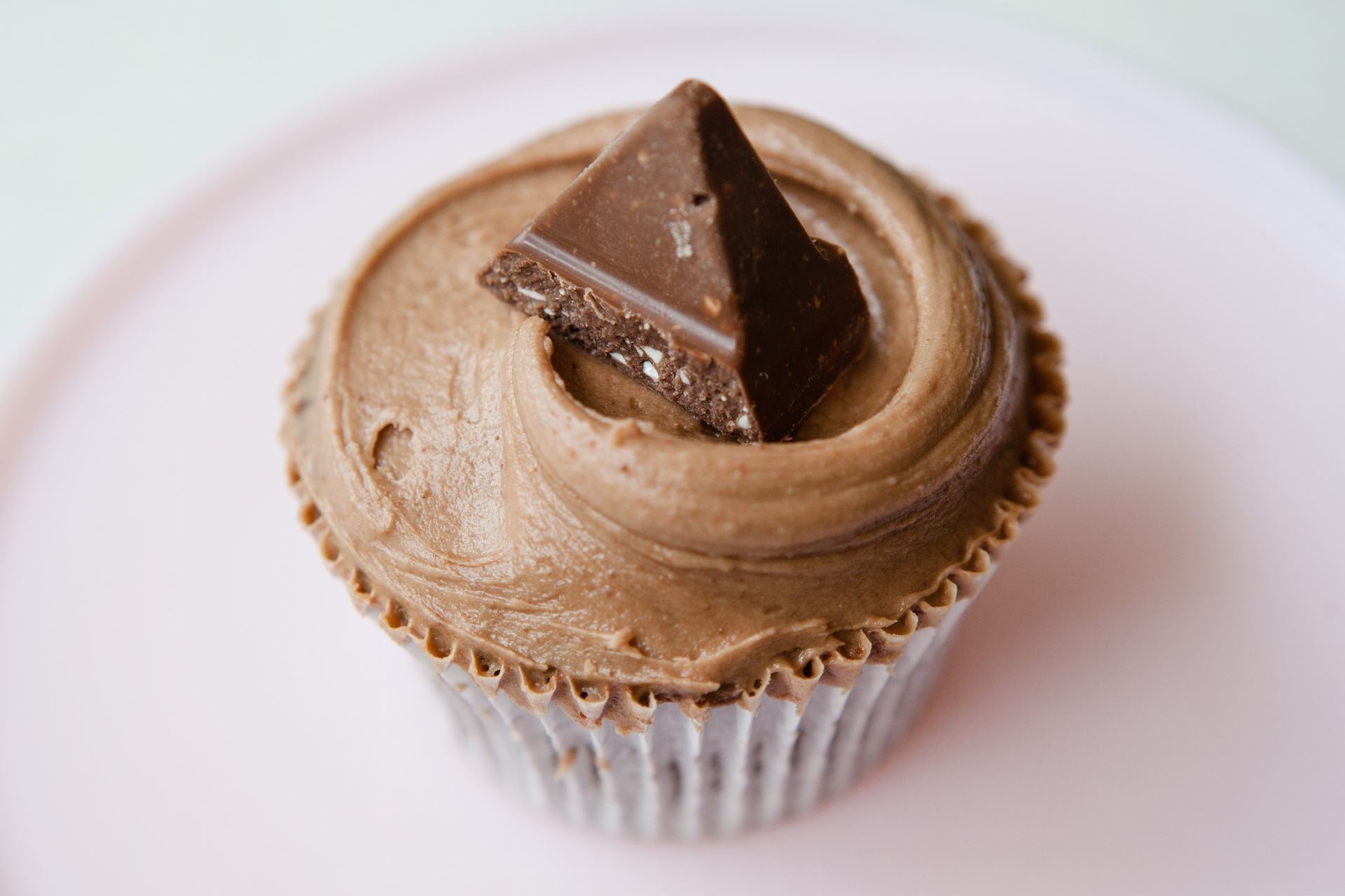 An extra special cupcake with a dark chocolate base. We bake a Toblerone chocolate triangle into each cupcake so that each mouthful has a delicious nougat chocolate filling. We top these off with a smooth chocolate and honey icing and a piece of Toblerone.