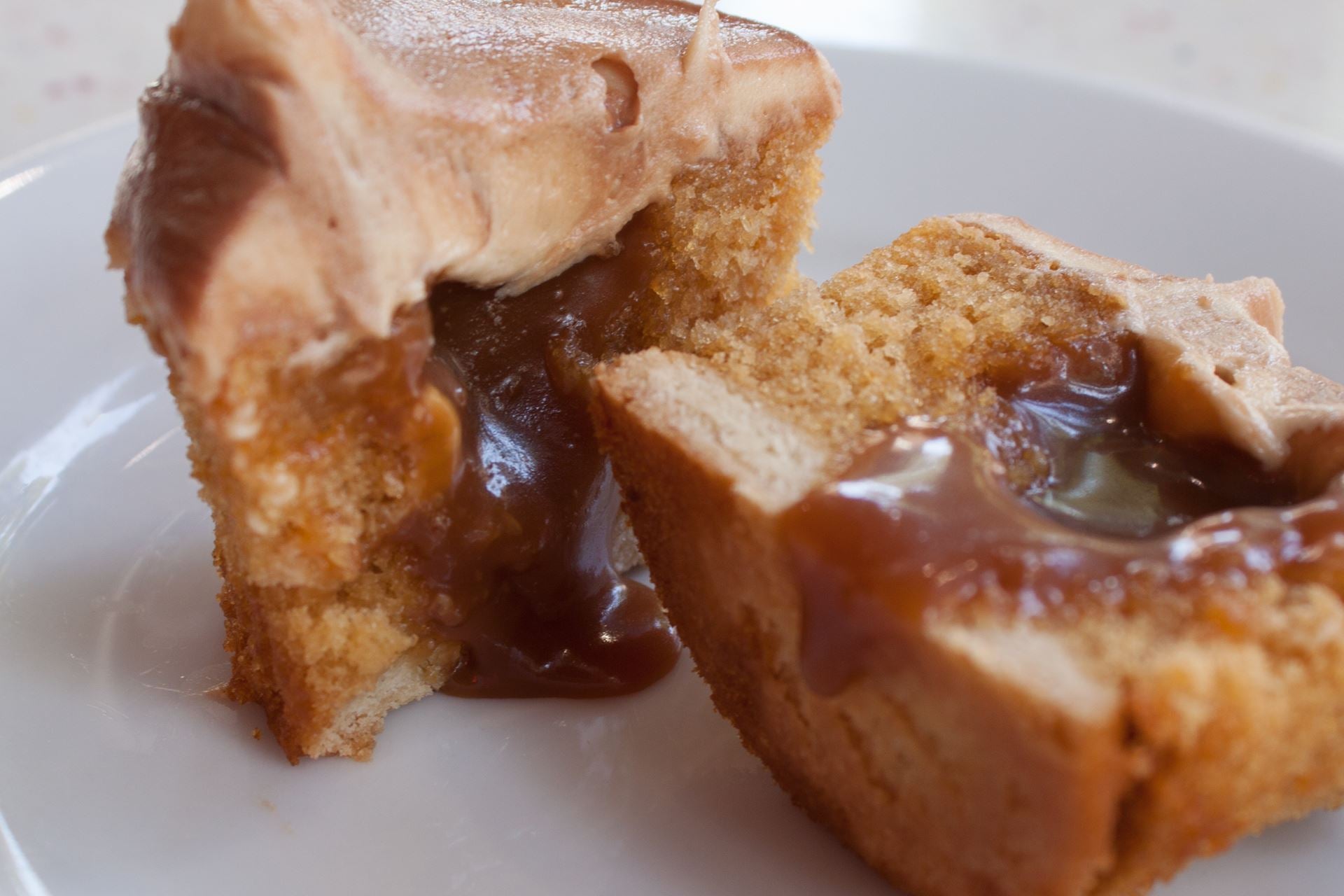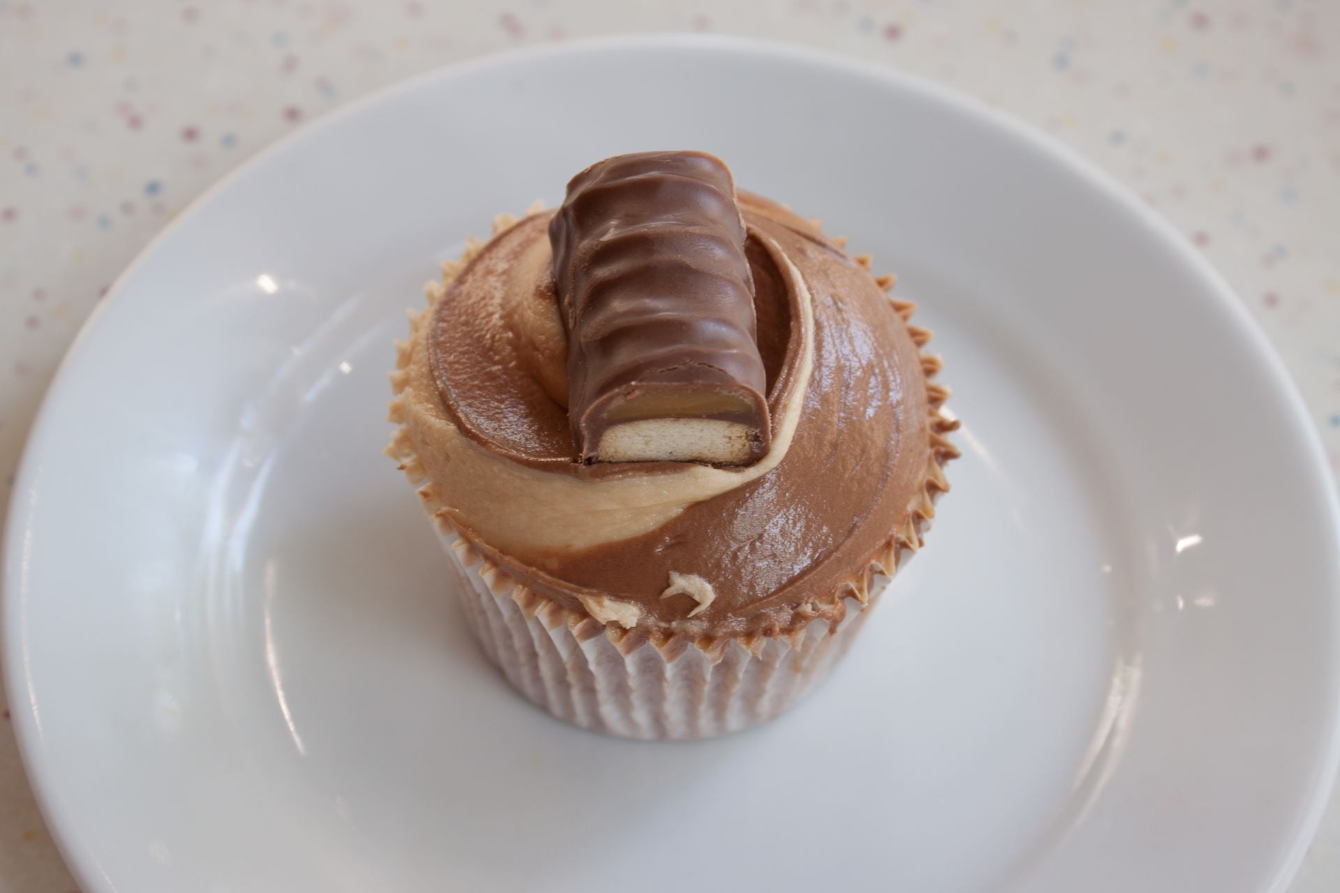 A biscuit base, a caramel sponge, filled with caramel, iced with a chocolate and caramel swirled buttercream and topped with a piece of Twix.